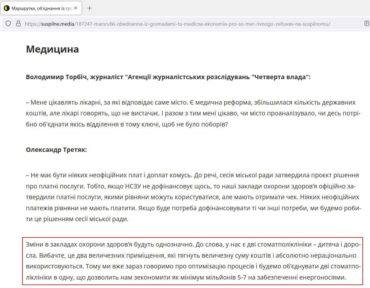 – Мене цікавлять лікарні, за які відповідає саме місто. Є медична реформа, збільшилася кількість державних коштів, але лікарі говорять, що не вистачає. І разом з тим мені цікаво, чи місто проаналізувало, чи десь потрібно об’єднати якісь відділення в тому ключі, щоб не було поборів?