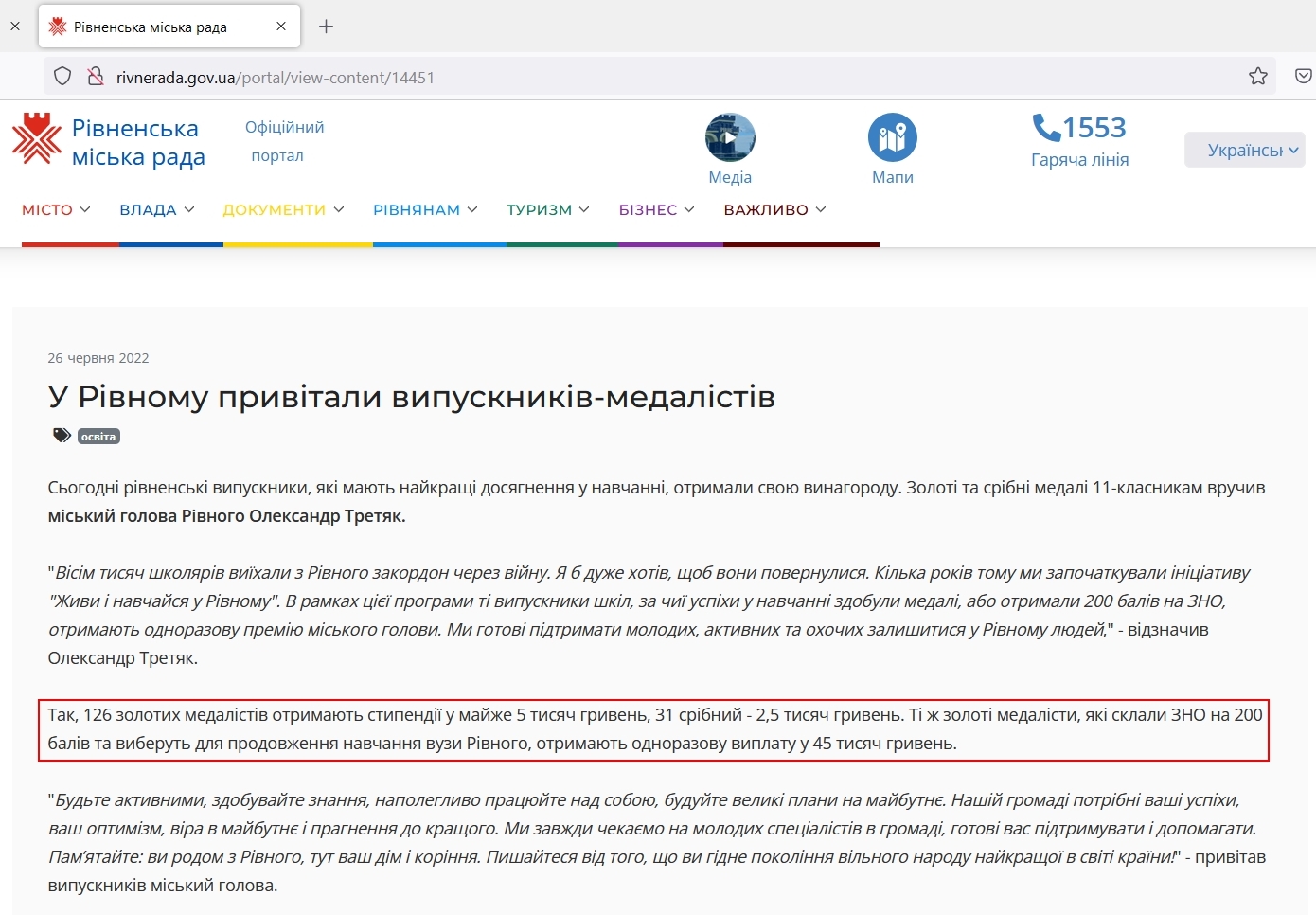 Під час цього заходу Олександр Третяк зазначив: «Кілька років тому ми започаткували ініціативу «Живи і навчайся у Рівному». В рамках цієї програми ті випускники шкіл, за чиї успіхи у навчанні здобули медалі, або отримали 200 балів на ЗНО, отримають одноразову премію міського голови. Ми готові підтримати молодих, активних та охочих залишитися у Рівному людей».