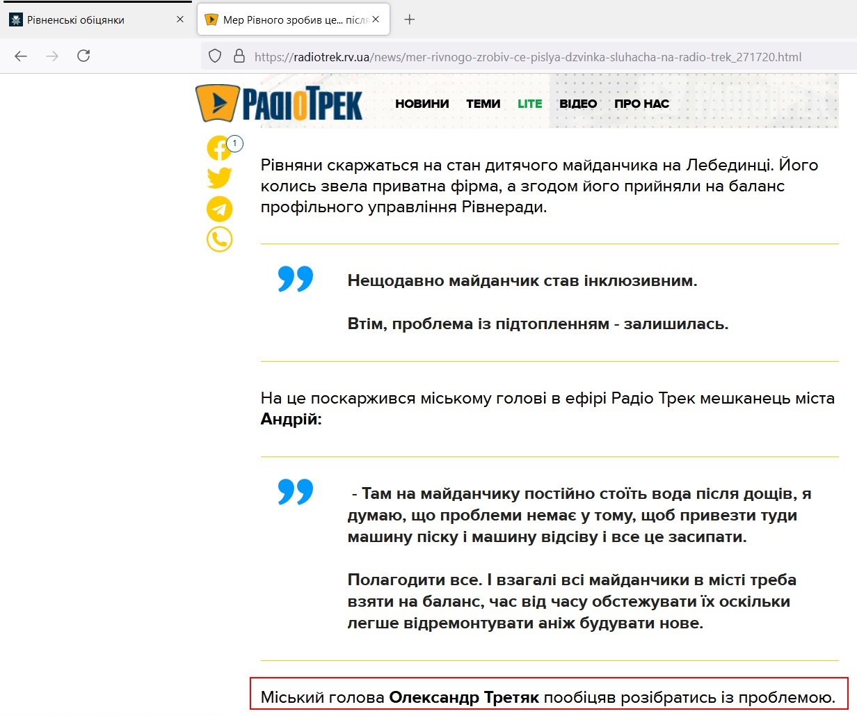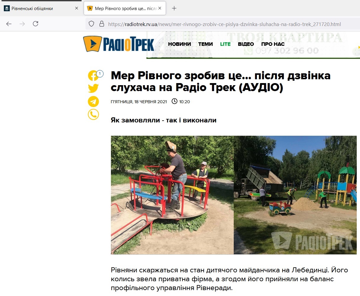Як повідомляє Сайт «Радіо Трек», вже наступного дня на майданчику працювали комунальники. На територію привезли пісок, гойдалки відремонтували. Також навколо об'єкту прибрали територію.